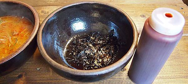 這個碗裡面裝的是香油和海苔,右邊這是醋辣醬。